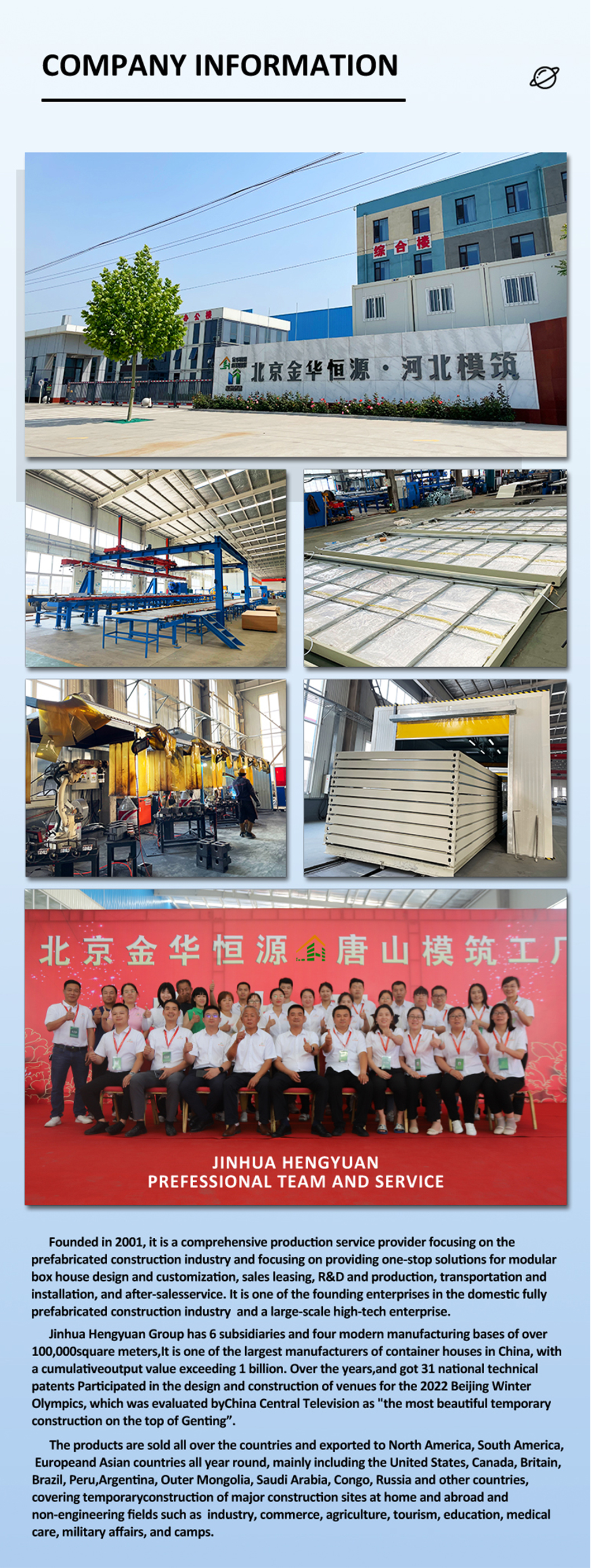 El Grupo Jinhua Hengyuan cuenta con seis filiales y cuatro modernas plantas de fabricación de más de 60.000 metros cuadrados. Es uno de los mayores fabricantes de casas contenedor en China, con una producción acumulada superior a los mil millones. A lo largo de los años, ha obtenido 31 patentes técnicas nacionales y ha participado en el diseño y la construcción de las sedes de los Juegos Olímpicos de Invierno de Pekín 2022, que la Televisión Central de China calificó como "la construcción temporal más hermosa en la cima de Genting".