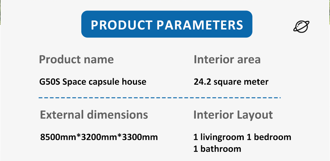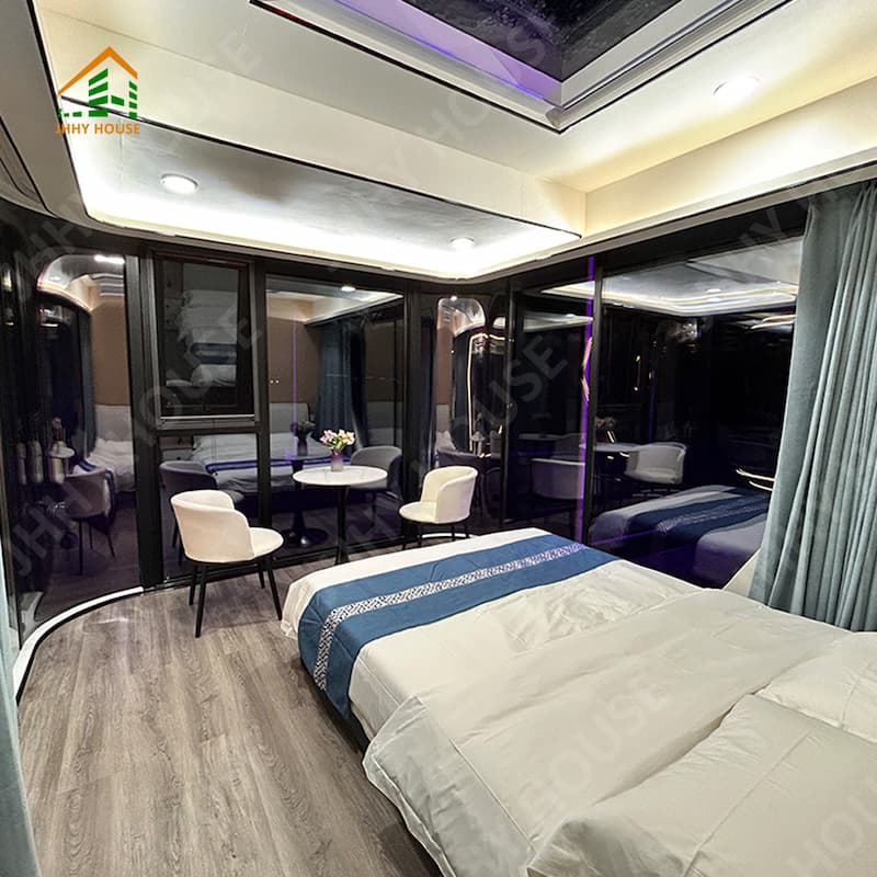 The main galvanized steel structural double frame Case aluminum plate (2.0mm) Shell surface treatment (fluorocarbon paint spraying process) 120mm polyurethane foam insulation Panoramic glass curtain wall (6+12A+6+12A+6 insulated low-e tempered glass) Panoramic glass oversized sunroof (6+6 laminated tempered glass+retractable canopy) Entry door (fire-rated steel door-with fingerprint waterproof combination lock) |