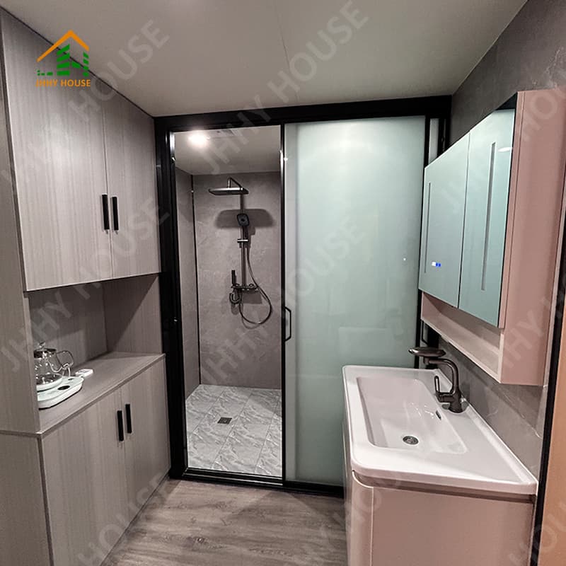 Suspended ceiling (OSB board+carbon fiber board) Interior wall surface(OSB board+carbon fiber board) board+carbon fiber board)Indoor flooring (SPc lock flooring) Underfloor heating systems Bathroom door(privacy sliding glass door) Washbasin (marble customized) Bathroom walls (SPC lock board) Bathroom floor (tiles) Furniture such as beds, nightstands, sofas, etc. (can be customized) |